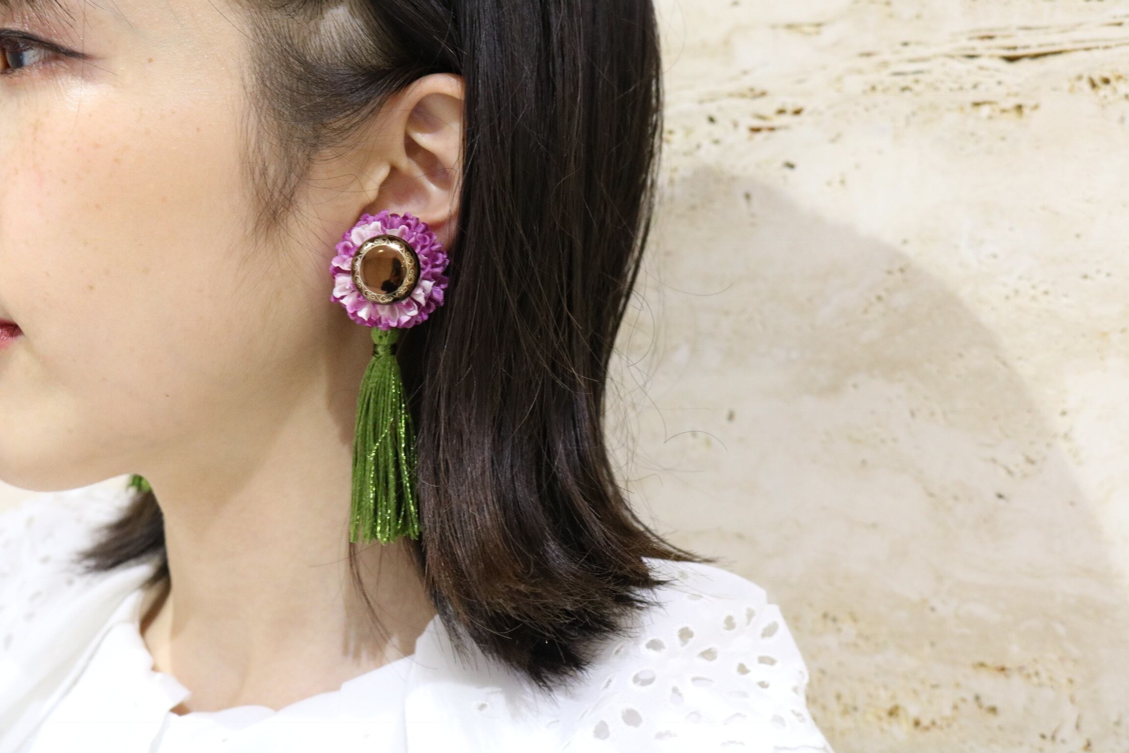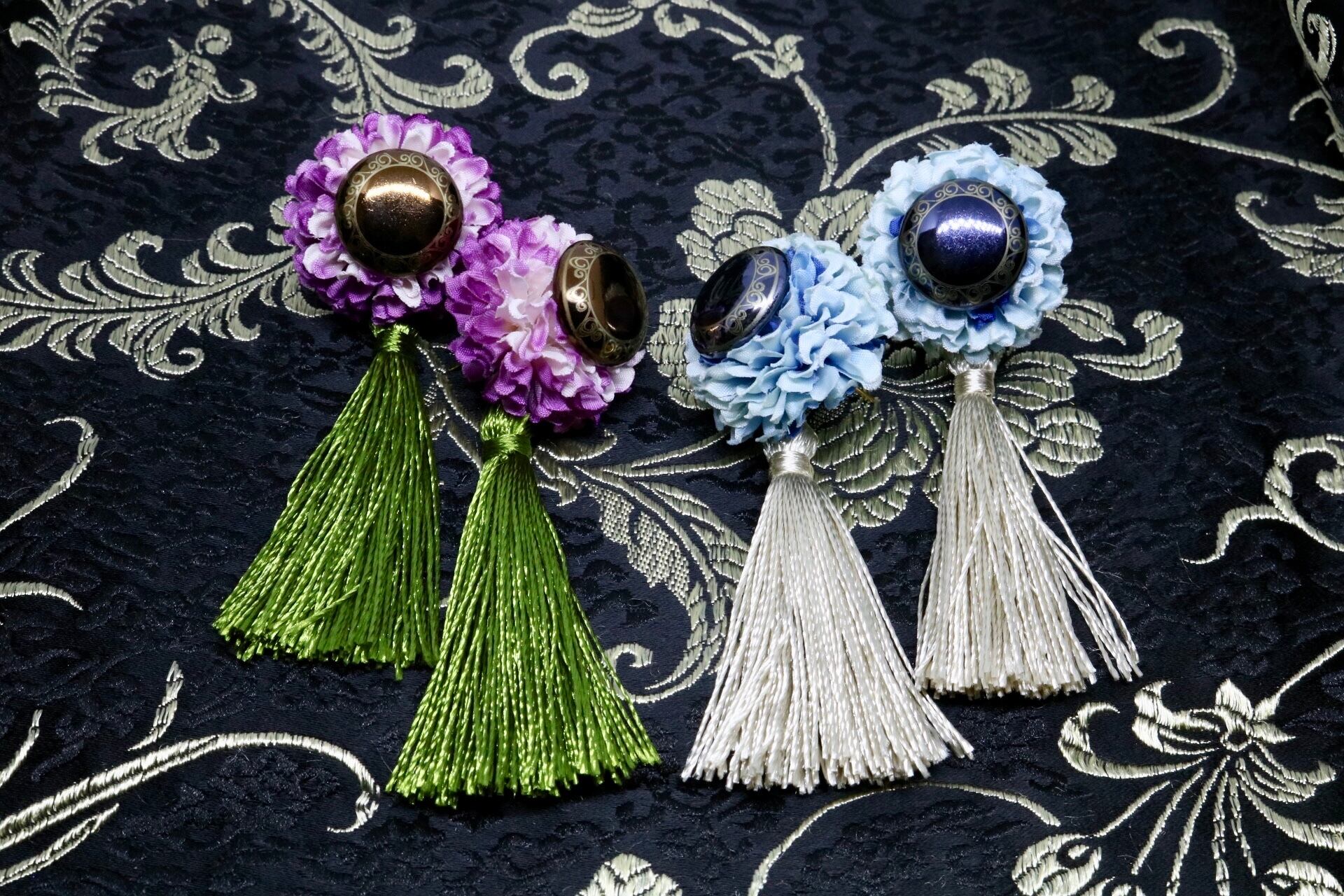 jiiiina original accessory artificial flower × button ピンク色の造花にブラウン鏡面カラーのボタンと、 モスグリーンのタッセルを合わせたアクセサリー。 size H85mm x W30mm ※ピアス イヤリング変更可 ご注文時、備考欄にて ピアスかイヤリングのどちらかを記載の上ご注文ください。