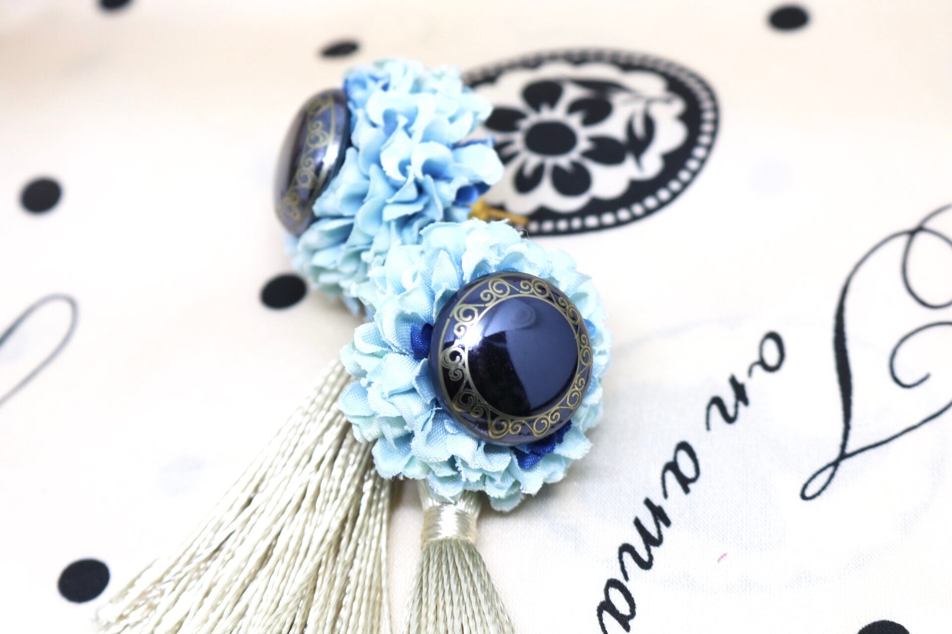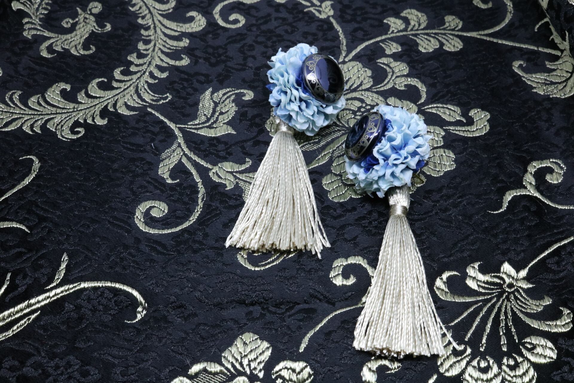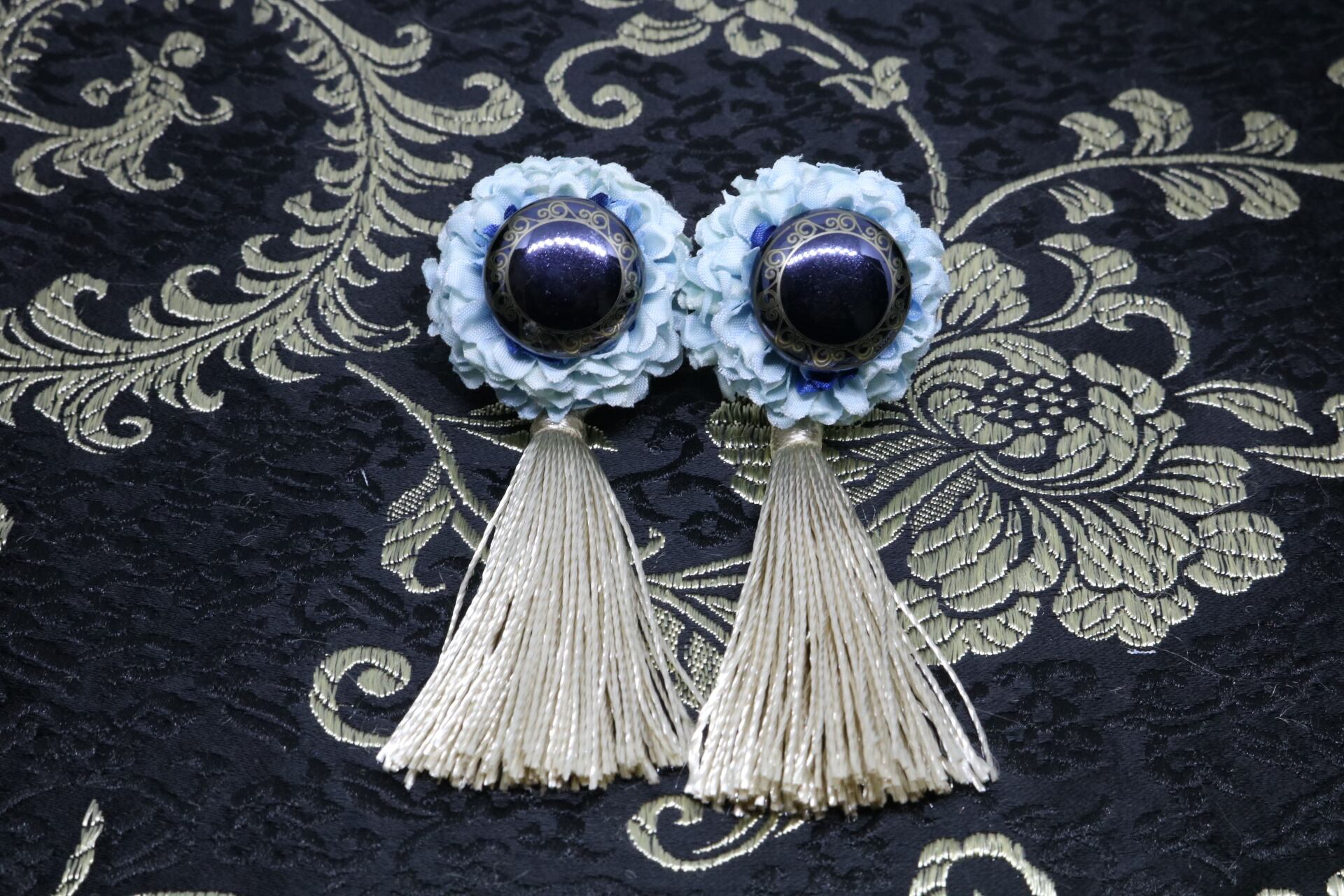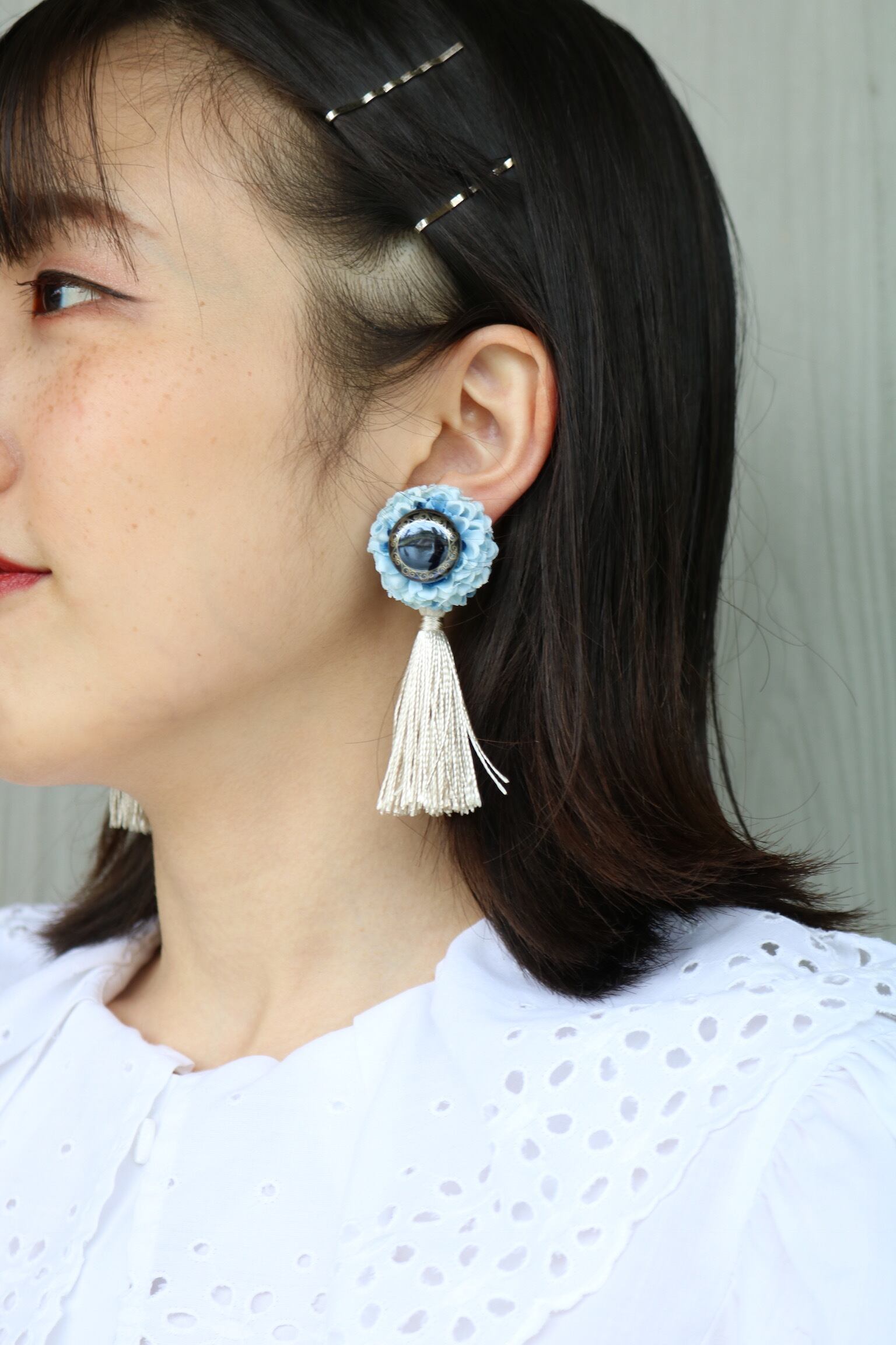 jiiiina original accessory artificial flower × button 水色の造花にネイビー鏡面カラーのボタンと、 ホワイトのタッセルを合わせたアクセサリー。 size H72mm x W30mm ※ピアス イヤリング変更可 ご注文時、備考欄にて ピアスかイヤリングのどちらかを記載の上ご注文ください。
