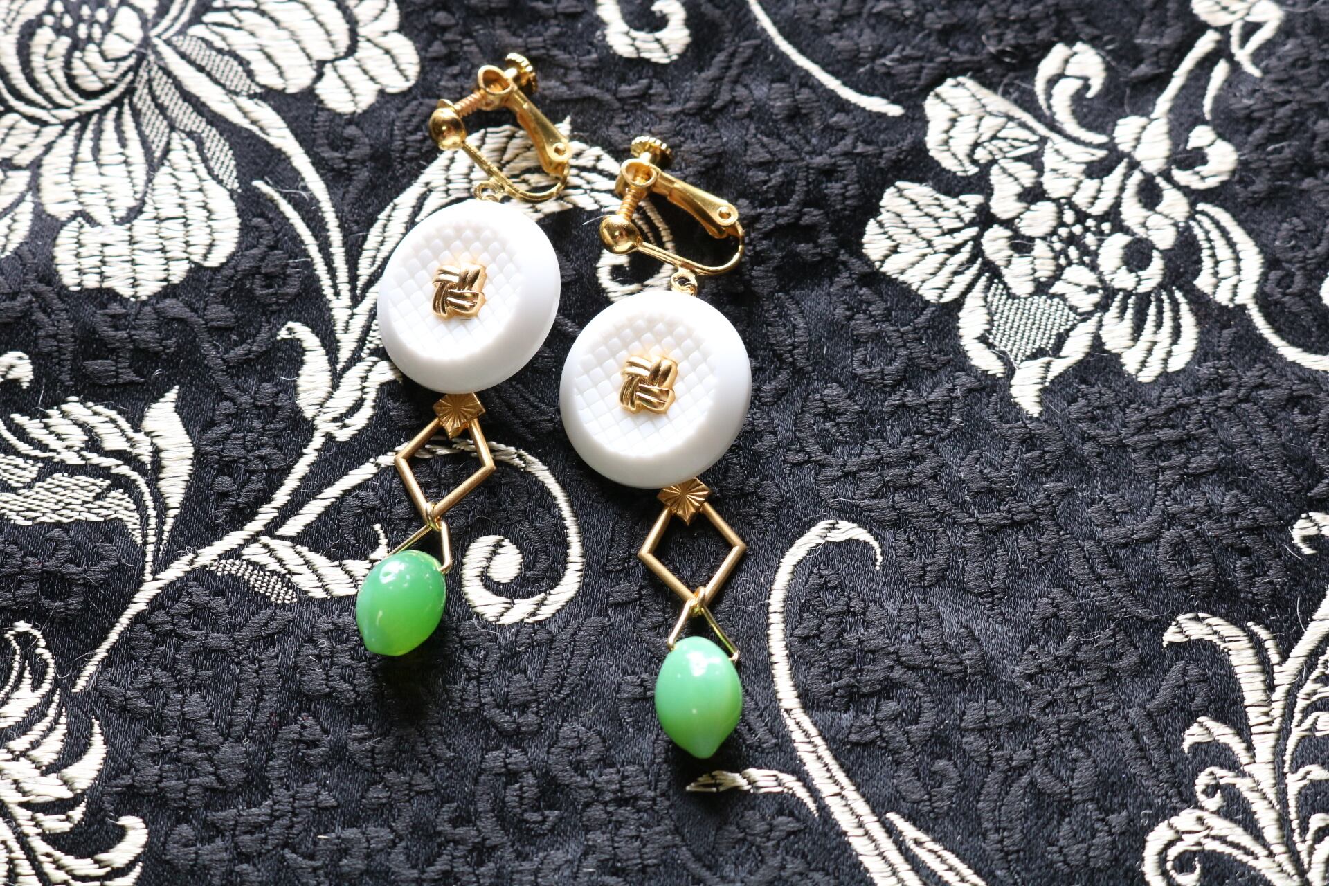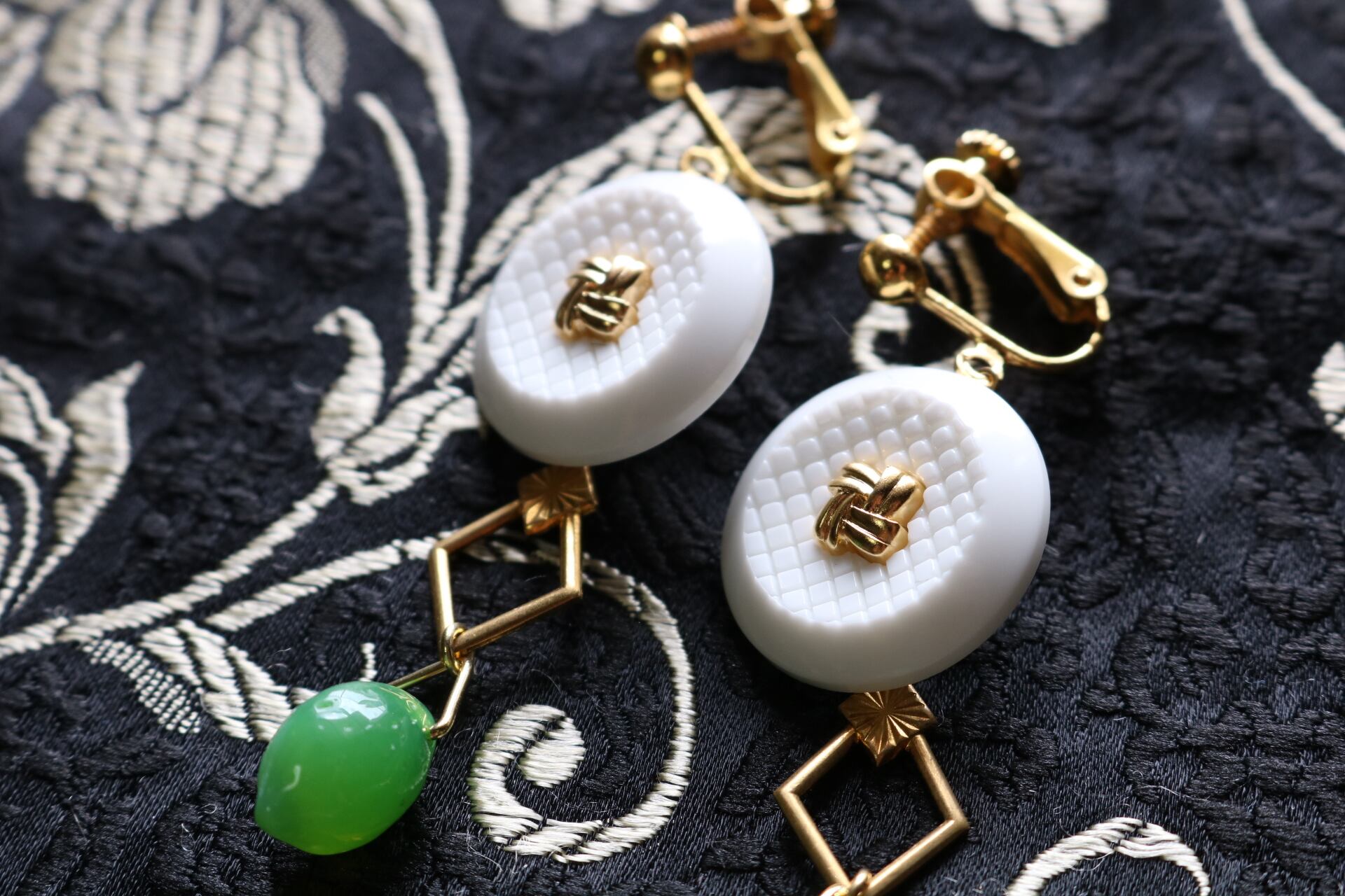 ホワイトベースにゴールドのポイントが施されたボタンと、ライトグリーンのドロップ型のようなビーズを合わせたアクセサリー。
