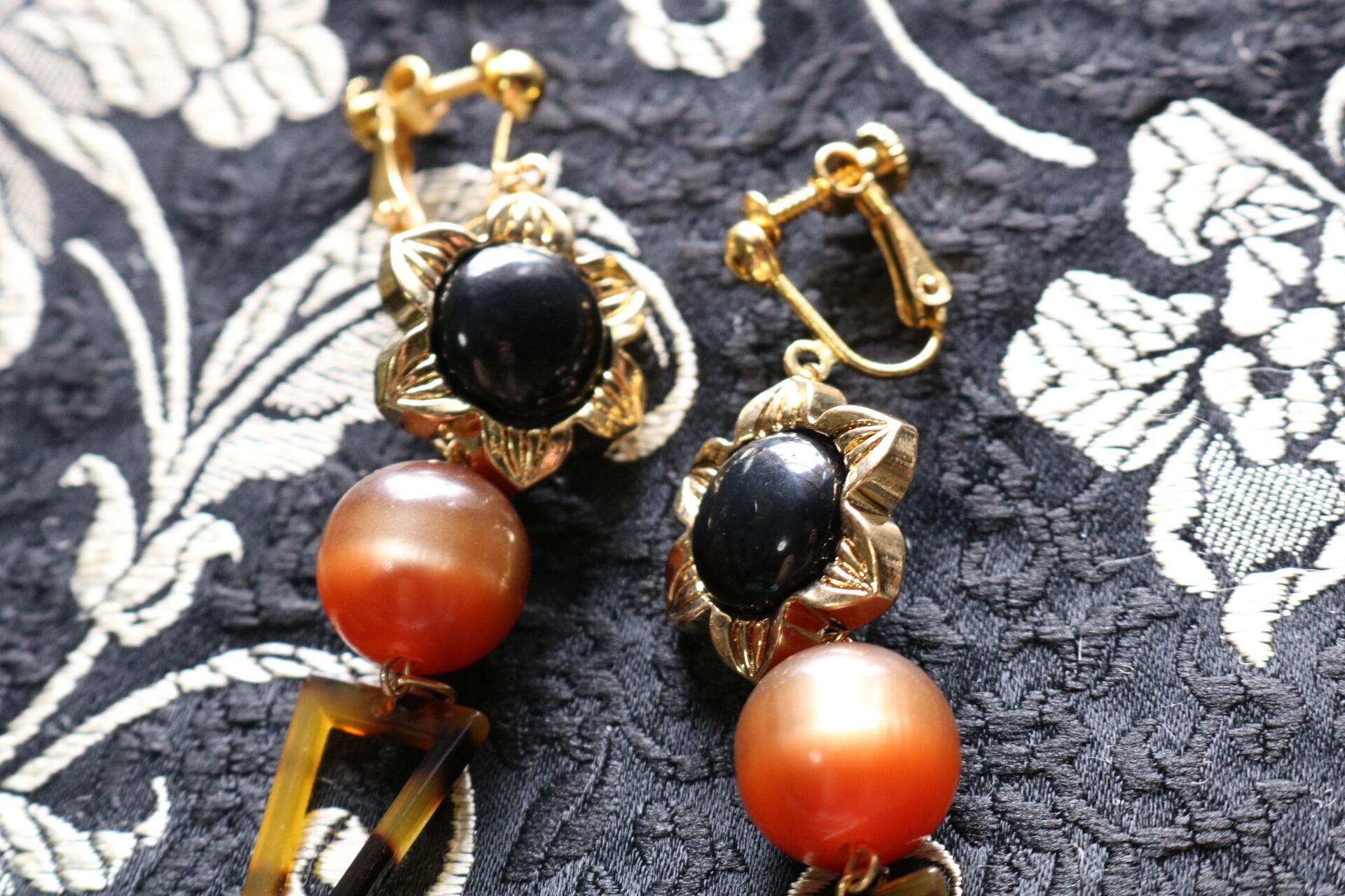 ゴールドとブラックでデザインされた花型のボタンと、シェルのように綺麗に光るブラウンのラウンドビーズ。