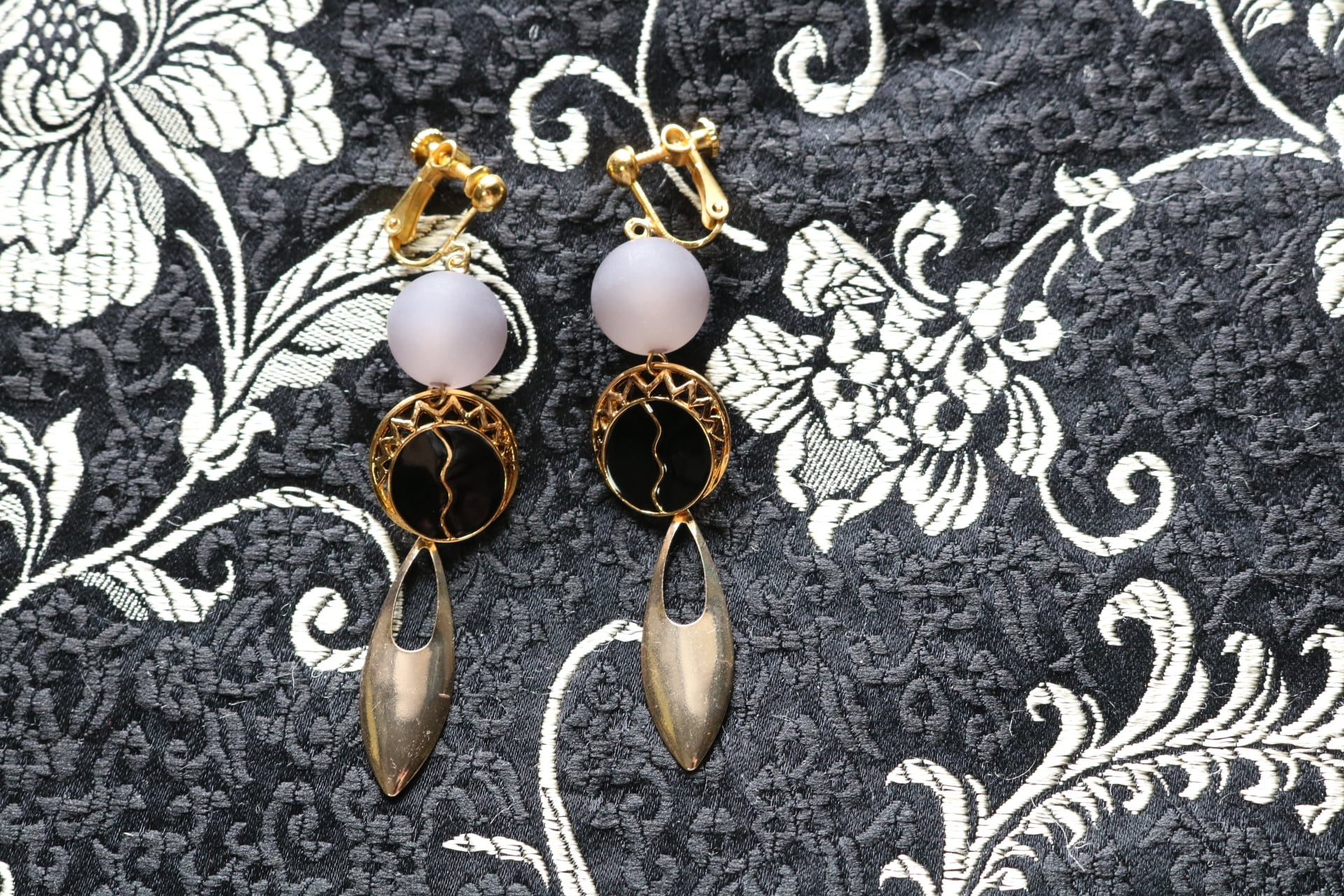 ゴールドとブラックでデザインされた透けのあるデザインボタンと、ムーンライトグレーのマットビーズ。マットでありがながら光に当てるとほのかに透ける綺麗なカラーです。