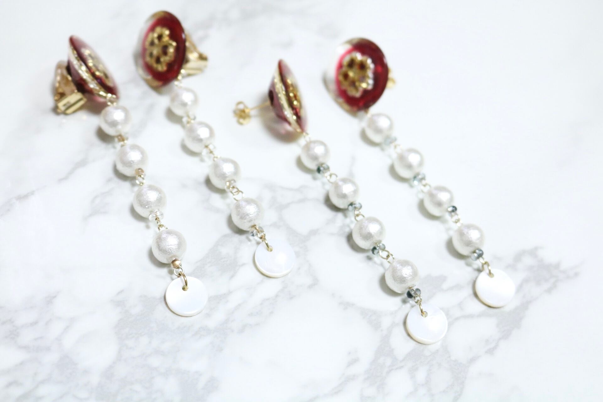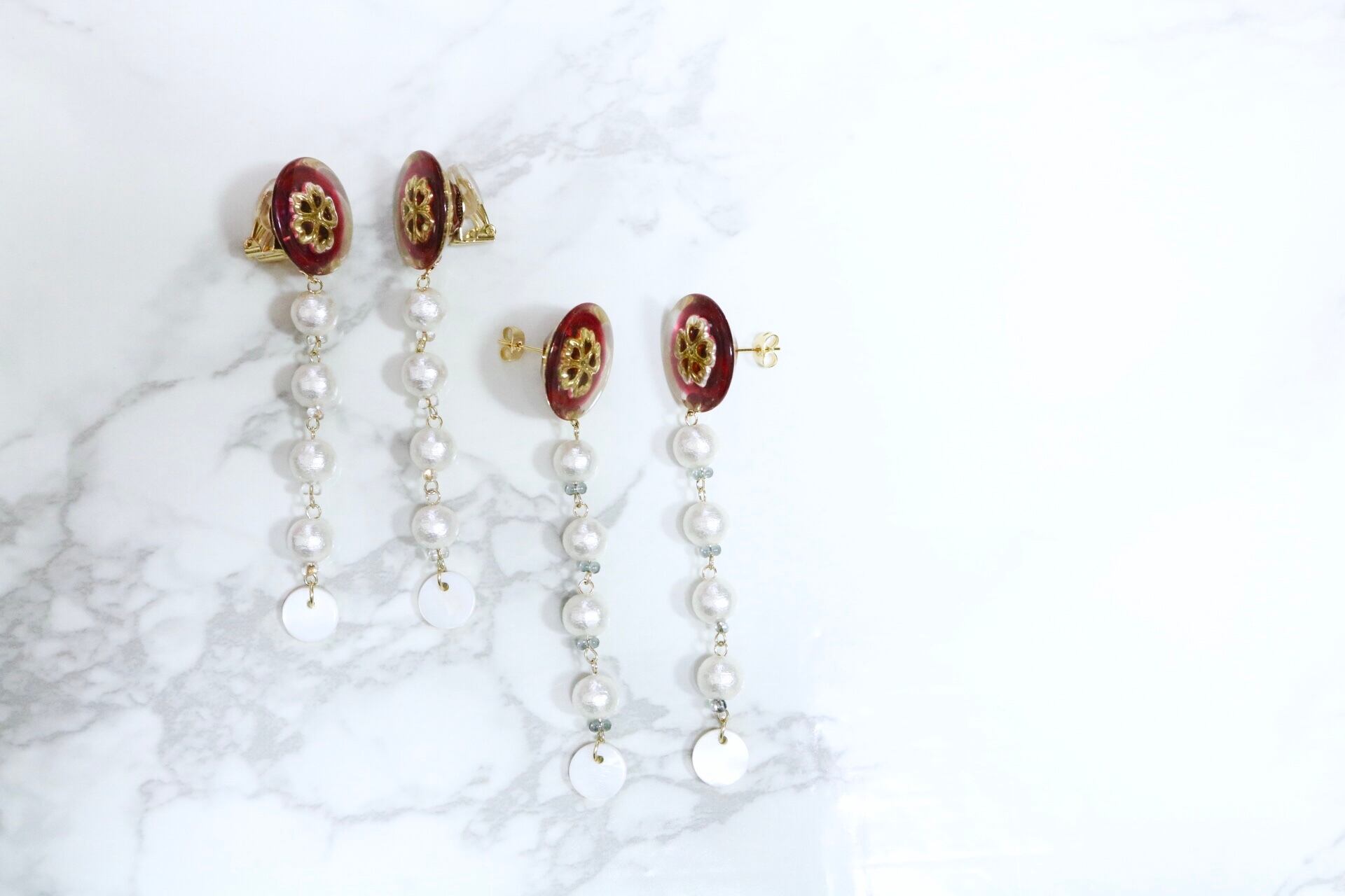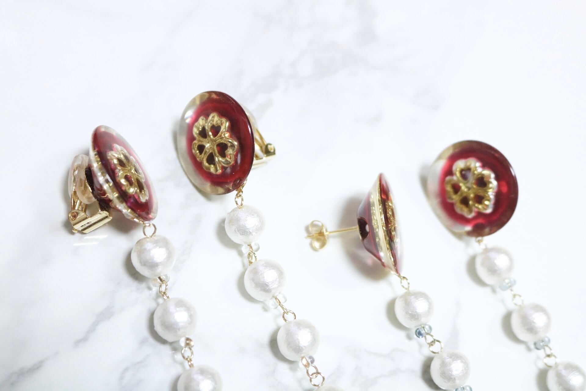 jiiiina original accessory “ かがよう綿の粒 ” pink flower クリアーにビビッドカラーのピンクと ゴールドの花がデザインされたボタン。 四連のコットンパールが揺れるアクセサリー。 size H89mm x W21mm 種類にてピアスかイヤリングかをお選びください。