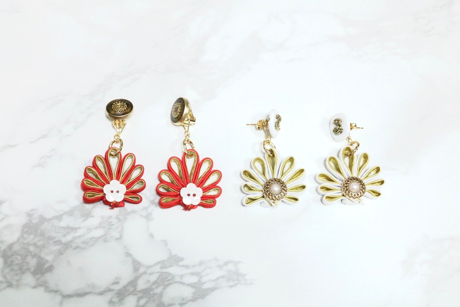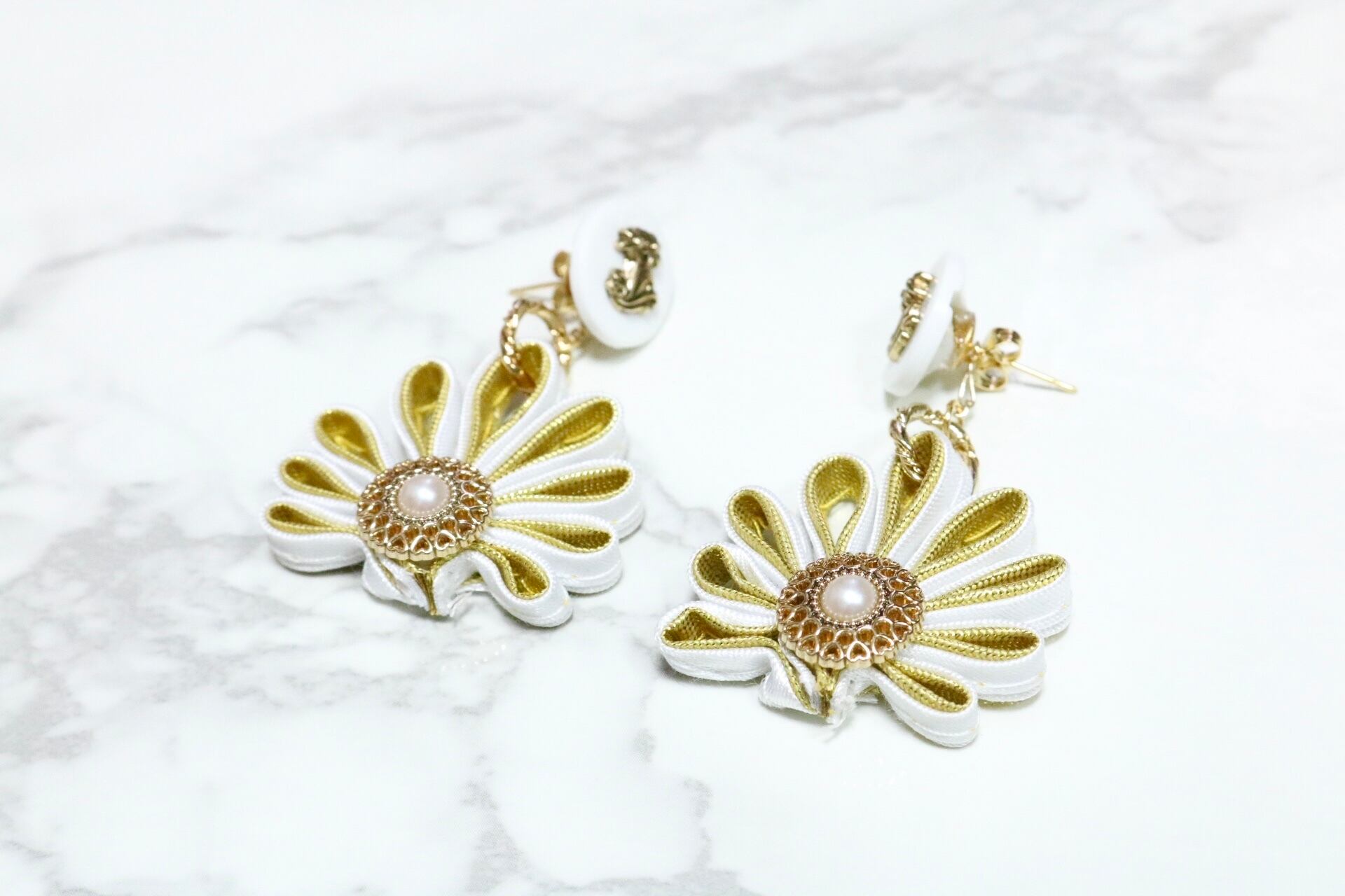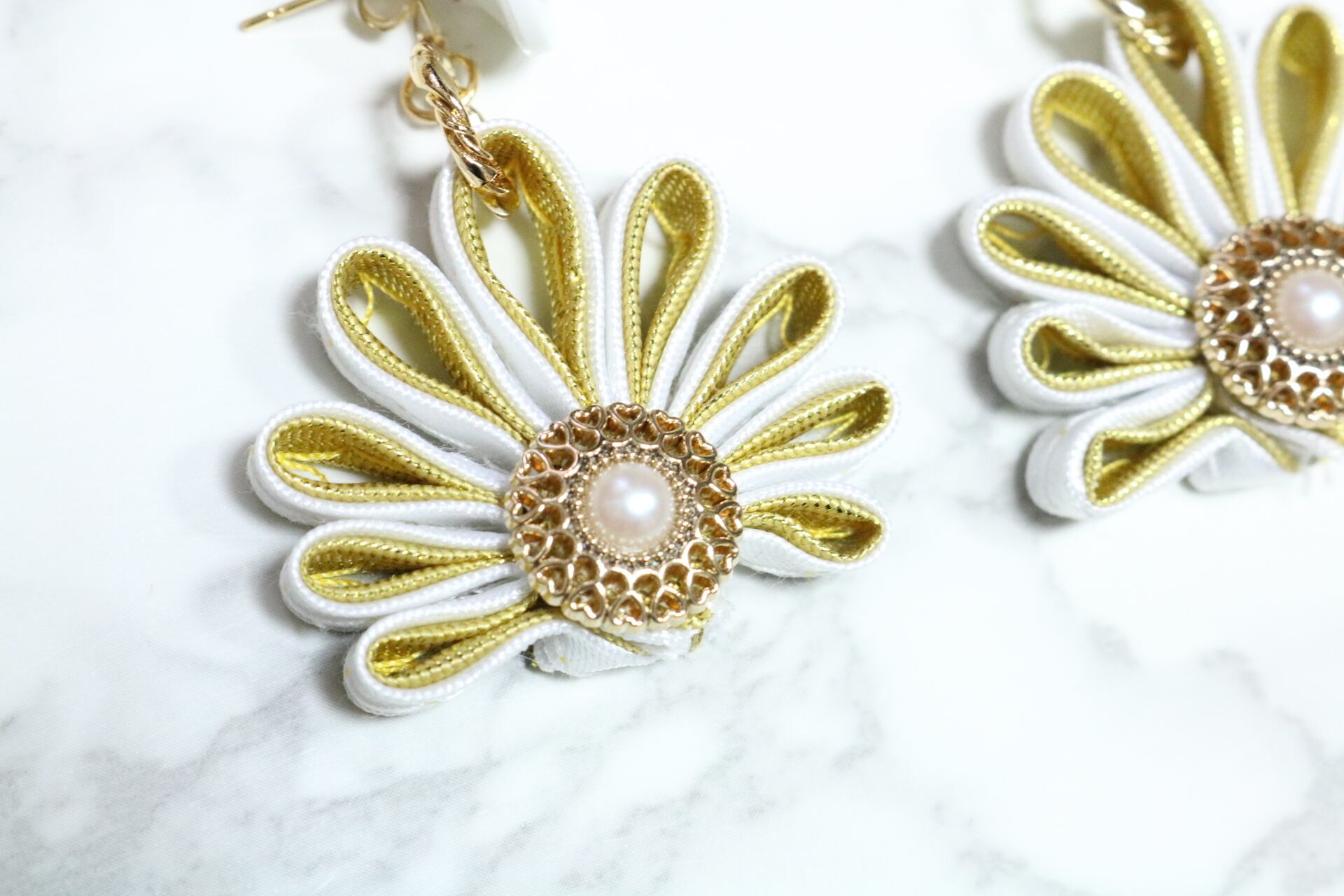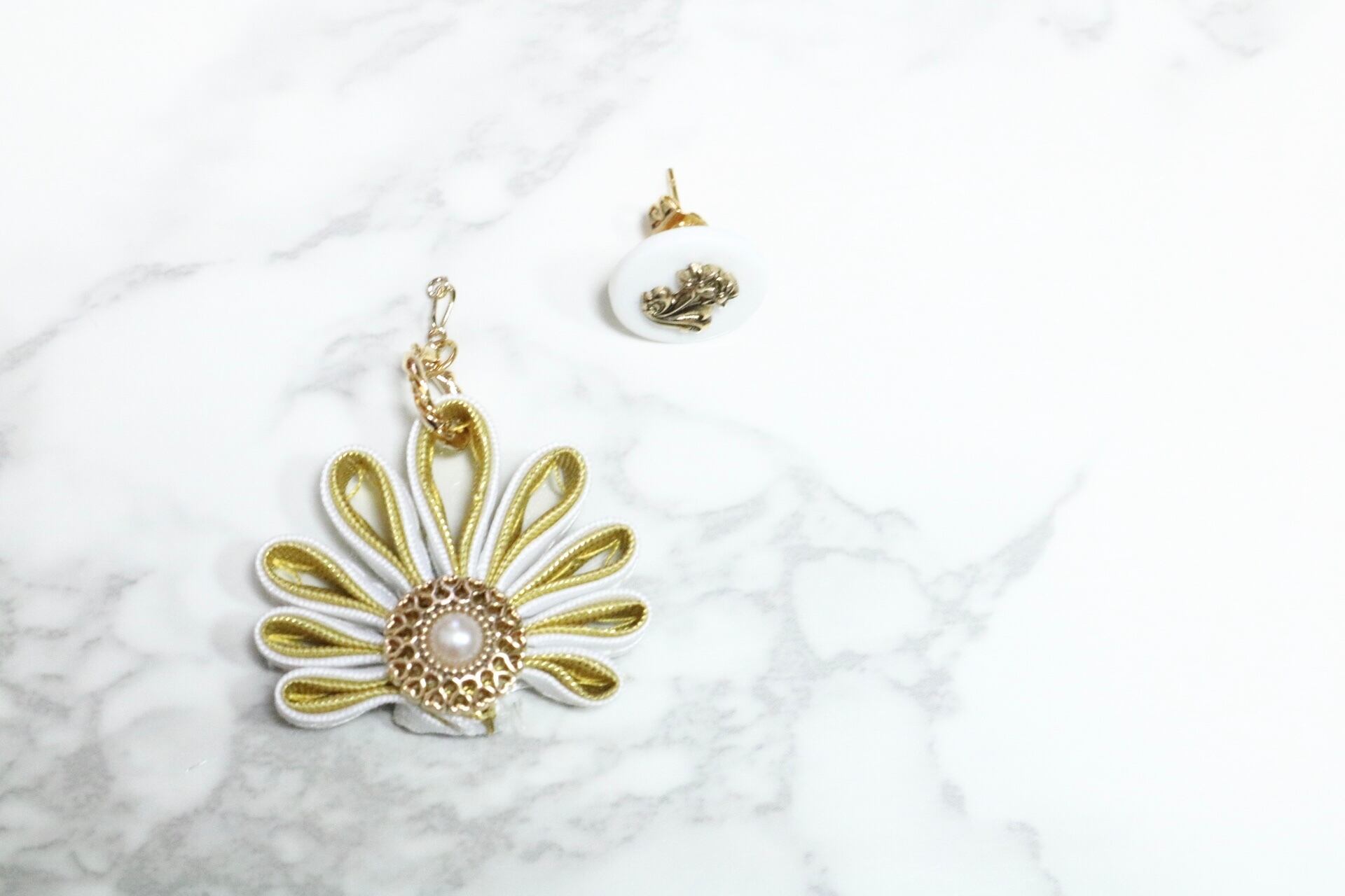 耳に止まる部分はホワイトベースにゴールドの花が装飾されたボタンのアクセサリー。