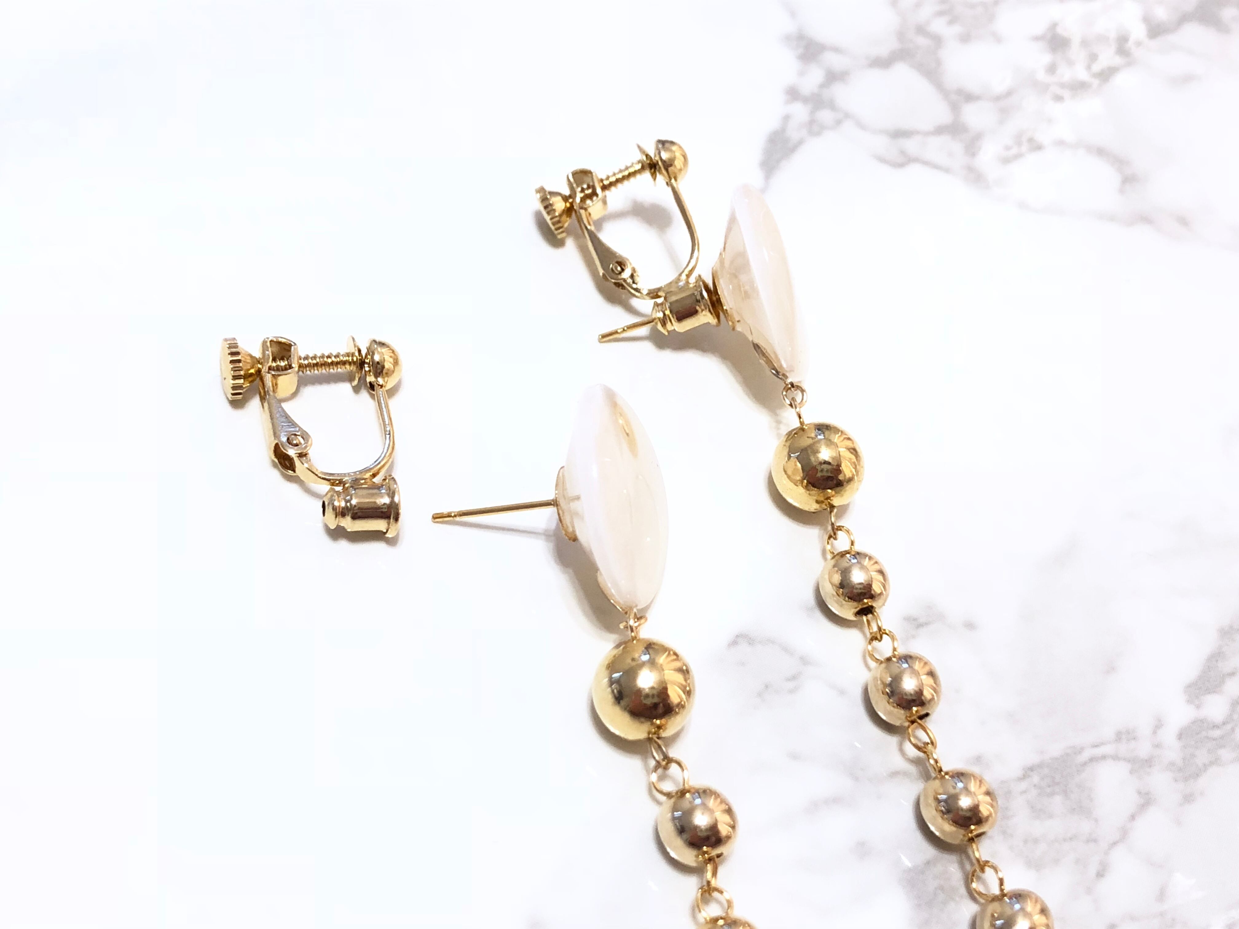 ピアスをイヤリングに変えるアイテム。 イヤリングの下についているキャッチ部分にピアスを差し込んで使用します。 写真2枚目は着用イメージです。アクセサリーは付属しませんのでご注意ください。