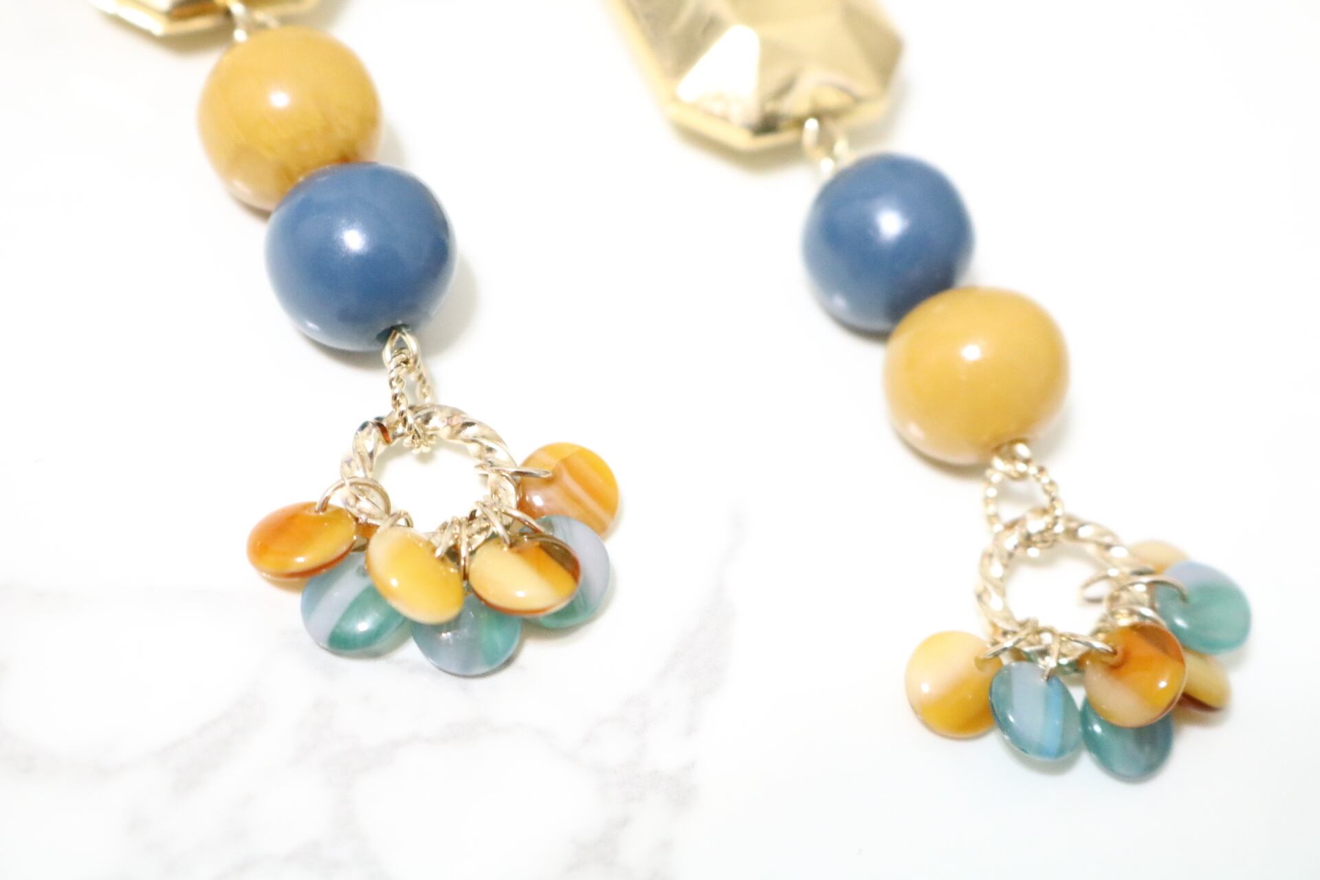ブルーとイエローのラウンドビーズがついたアクセサリー。