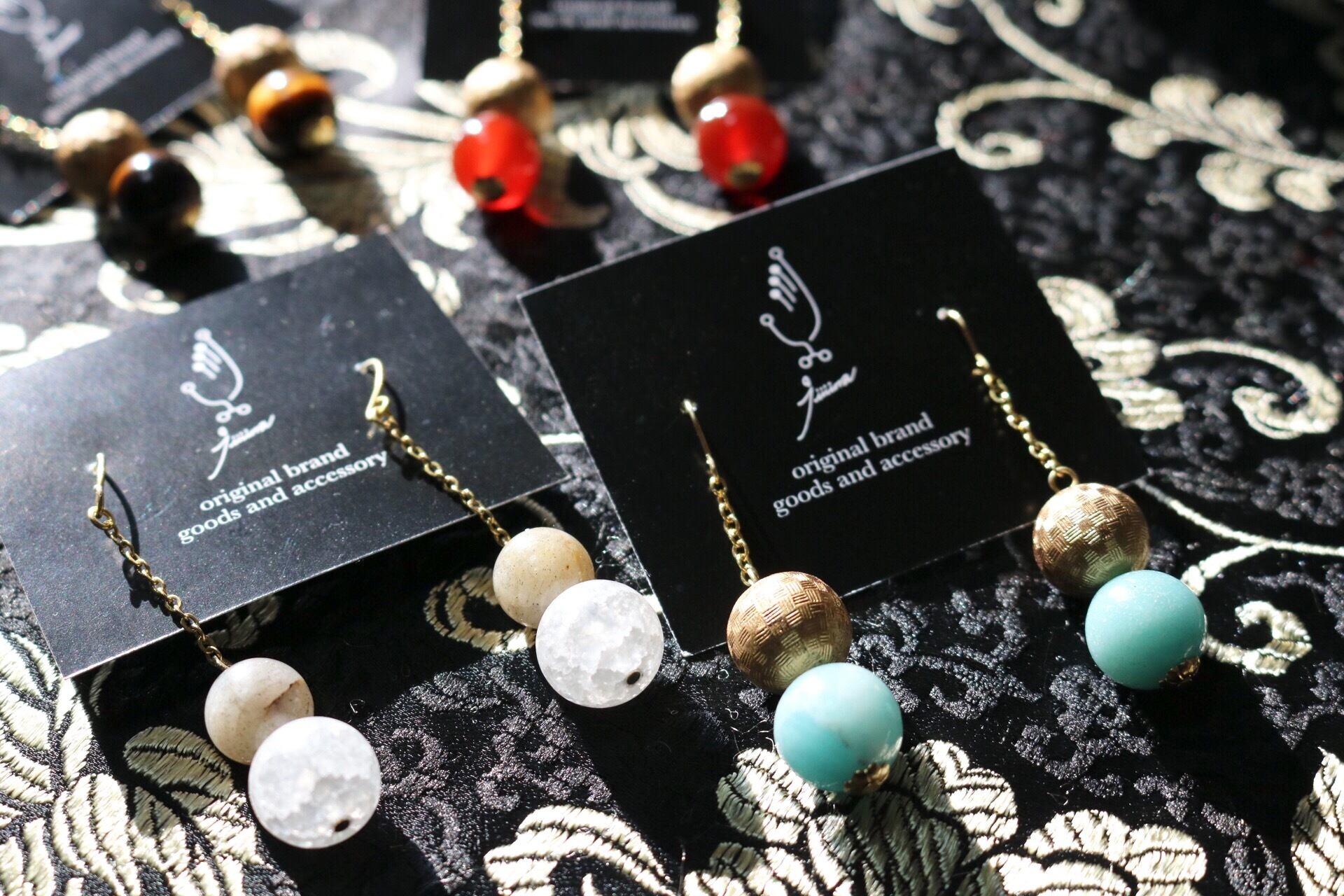 天然石と格子柄ヴィンテージパーツやクラッククォーツを組み合わせたアクセサリー。