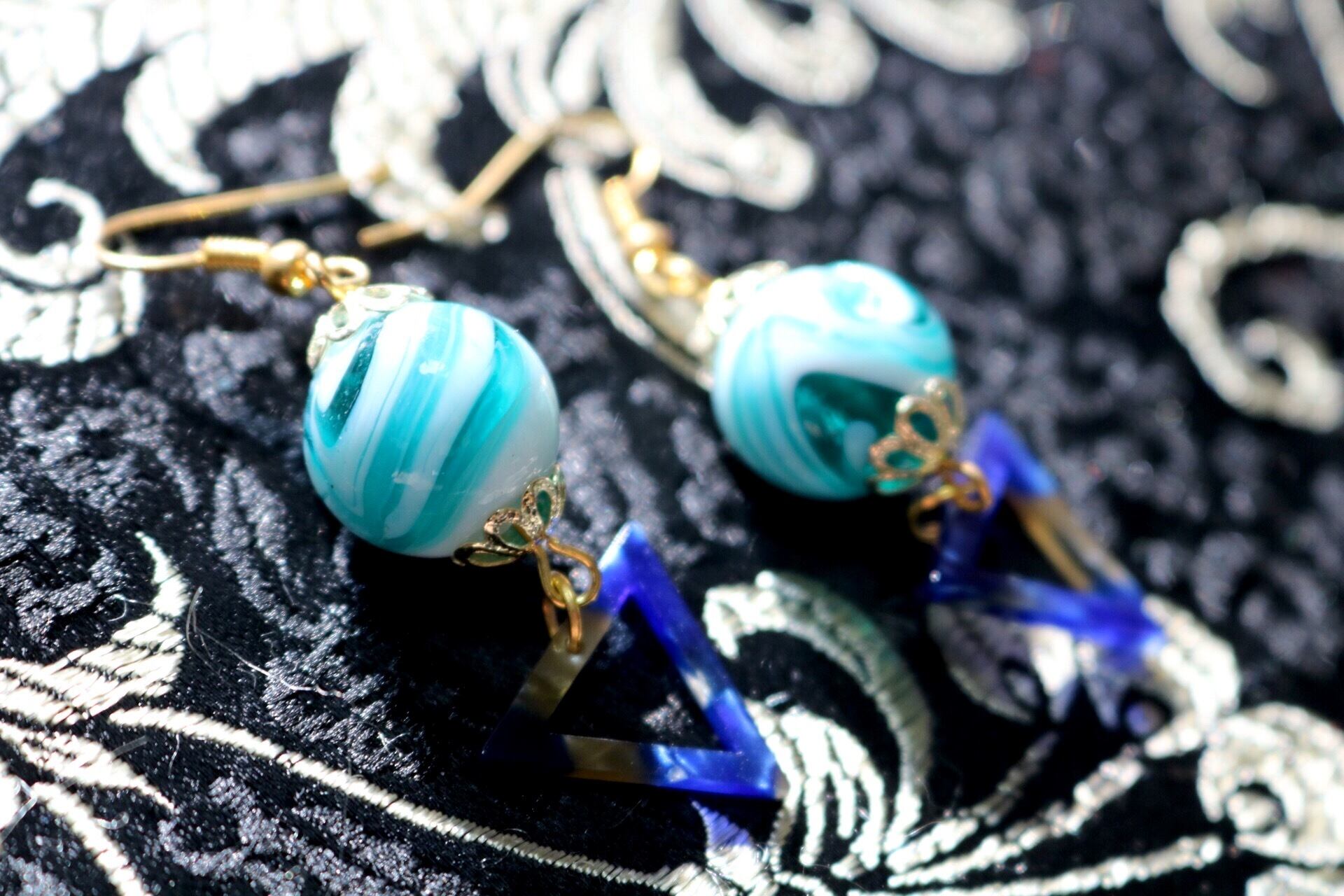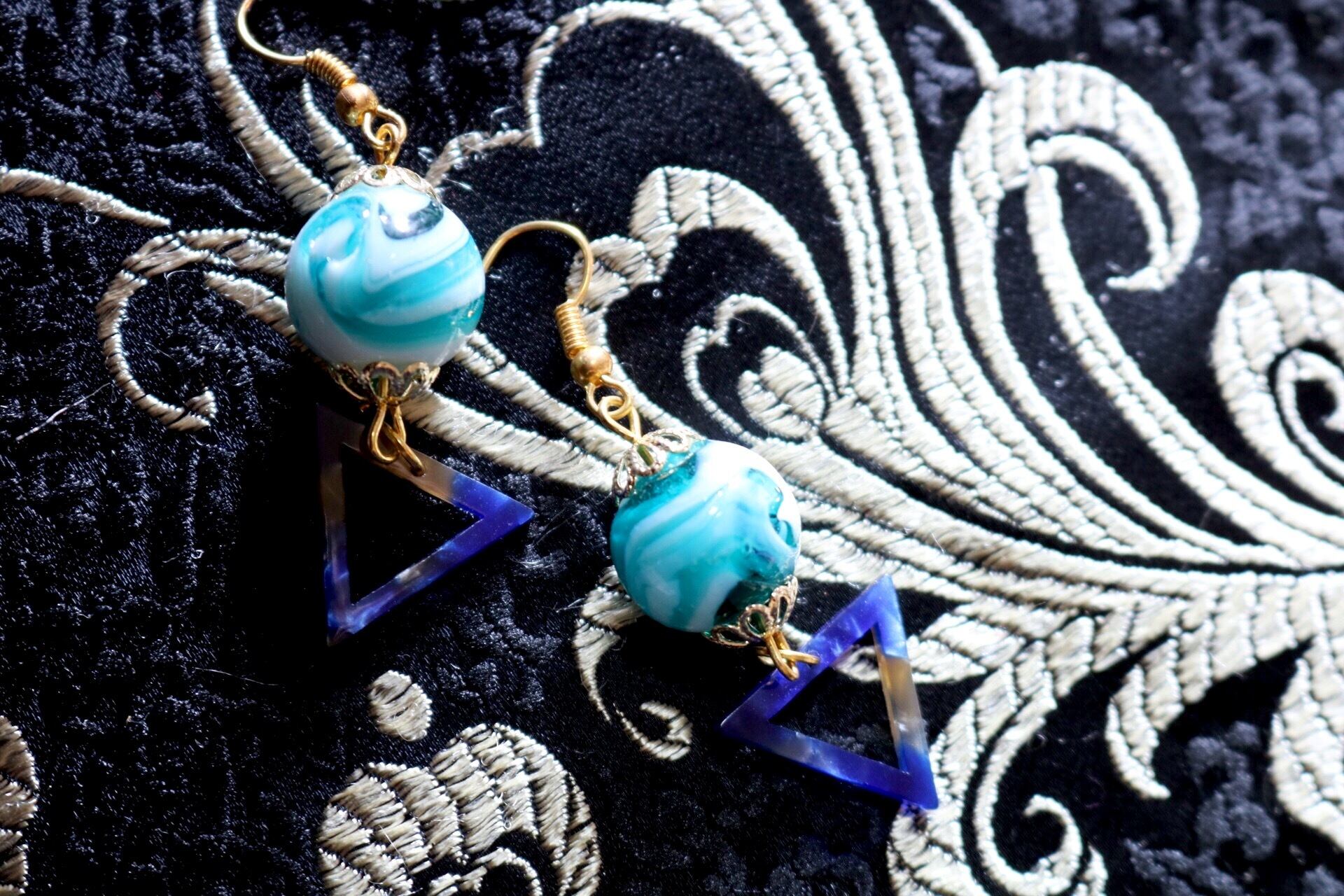 jiiiina original accessory marble × triangle 水色と白のマーブルガラス玉に、 青いシェルのような柄のトライアングルをデザイン。 0 size H38mm x W18mm(金具部分を除くサイズ) ※イヤリング変更可 ご注文時、備考欄にて「イヤリング変更希望」とお伝えください。