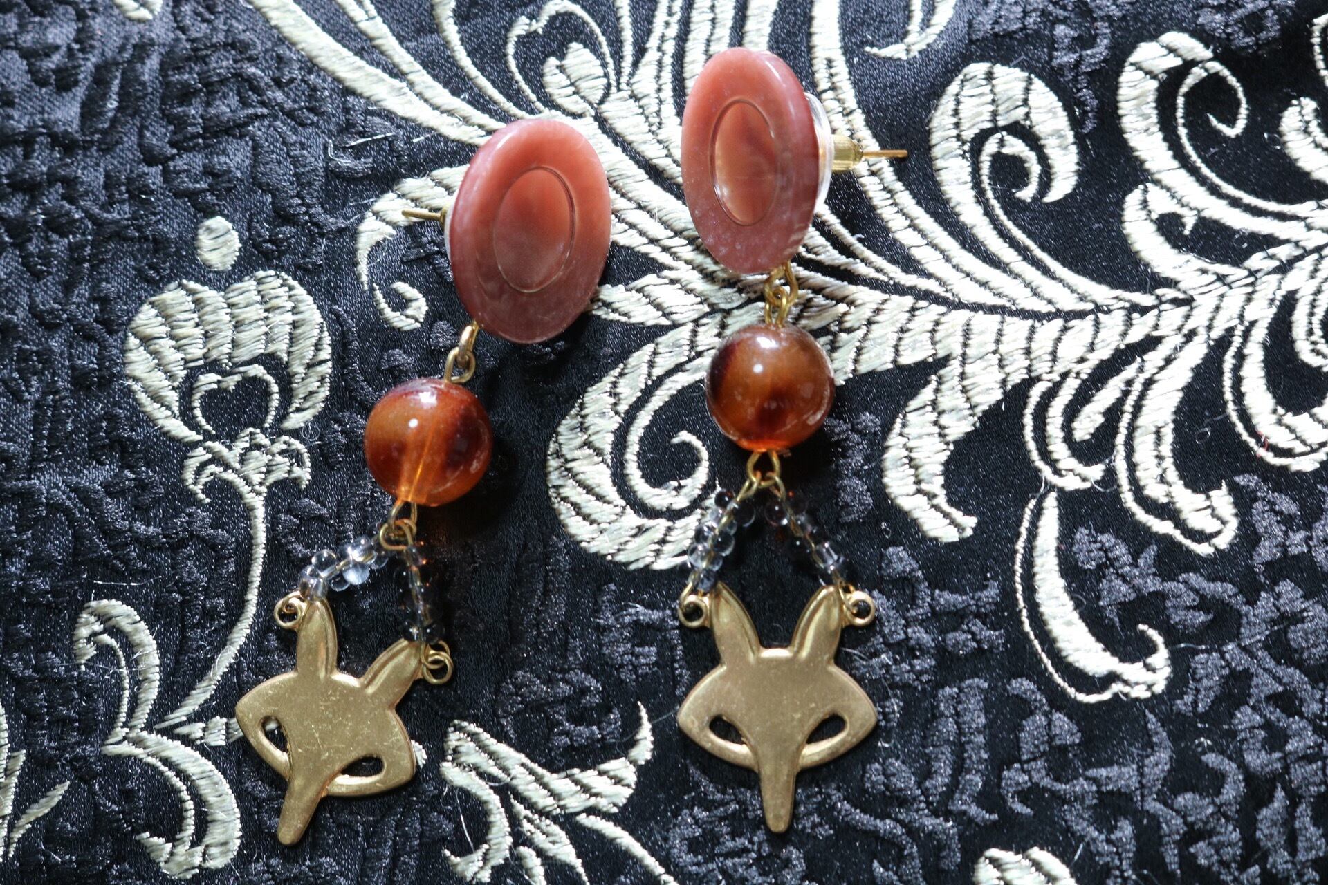 jiiiina original accessory button × gold fox ダスティーピンクのボタンに べっこうやグレーのビーズを使い、 ゴールドで作られたキツネチャームをデザイン。 size H70mm x W18mm(金具部分を除くサイズ) ※イヤリング変更不可
