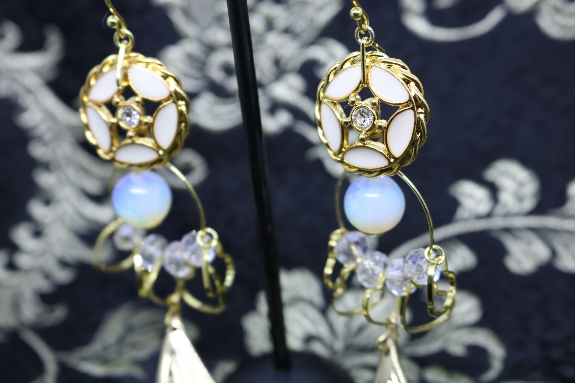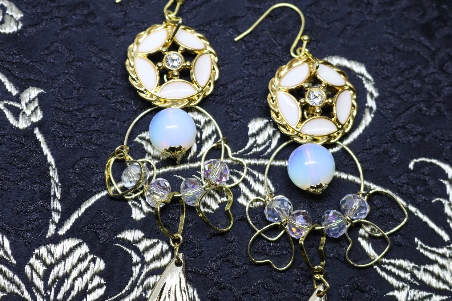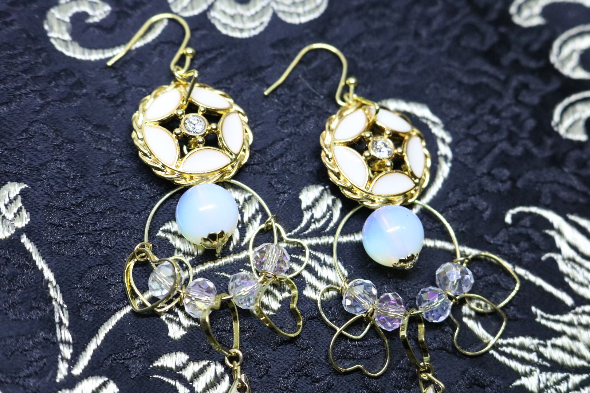 ゴールドとホワイト、中央にはスワロフスキーが入ったエトワール(星)デザインのボタン。その下に揺るはオーロラ加工のラウンドビーズと、ハート型パーツ。